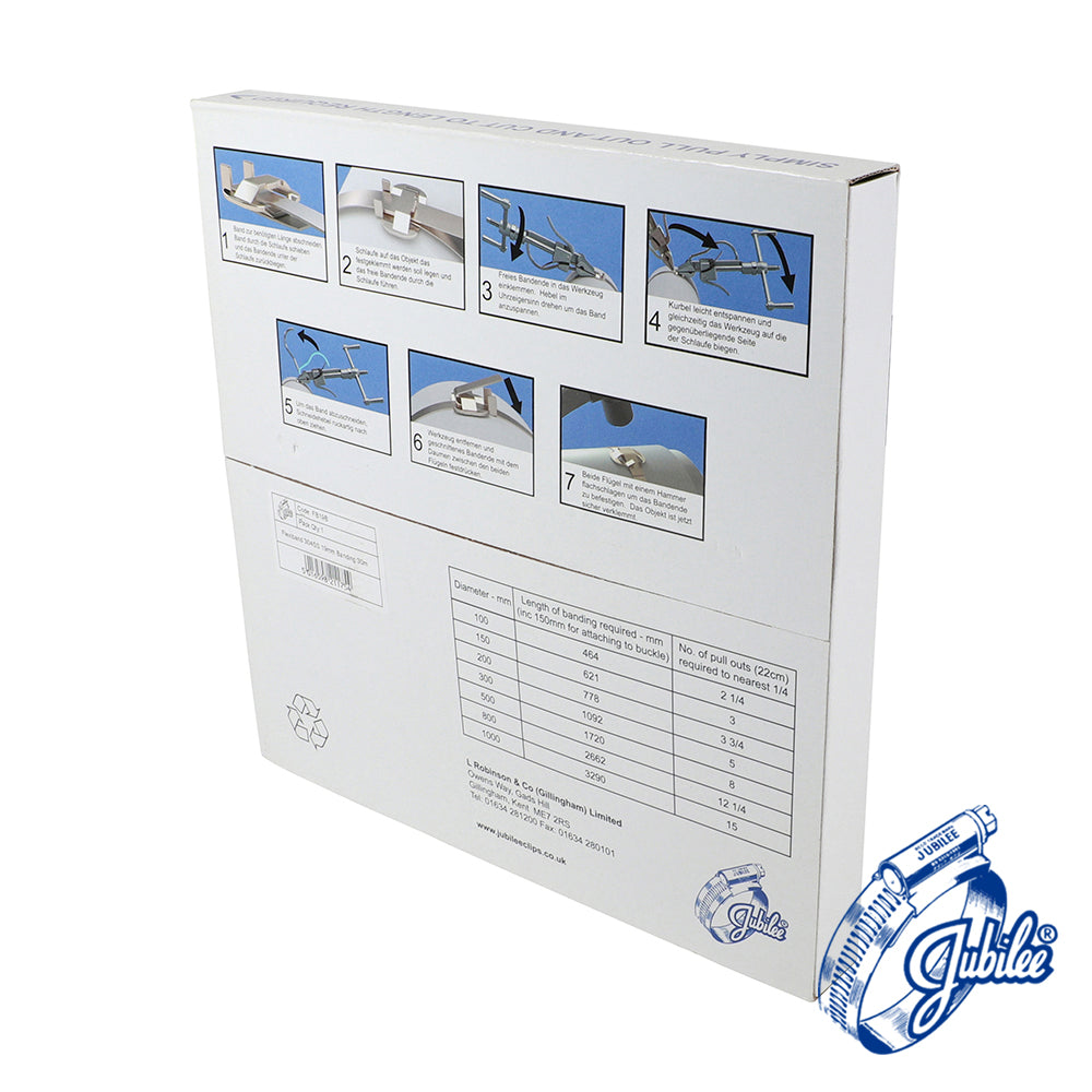 Jubilee Flexiband is a band and buckle system offering a high strength fastening solution in 304 Stainless Steel and provides 4 different band widths 9mm, 13mm, 16mm and 19mm. Flexiband is ideal for strapping items securely and can commonly be seen in applications such as sign fixing where the tamper proof nature of the product is of paramount importance.